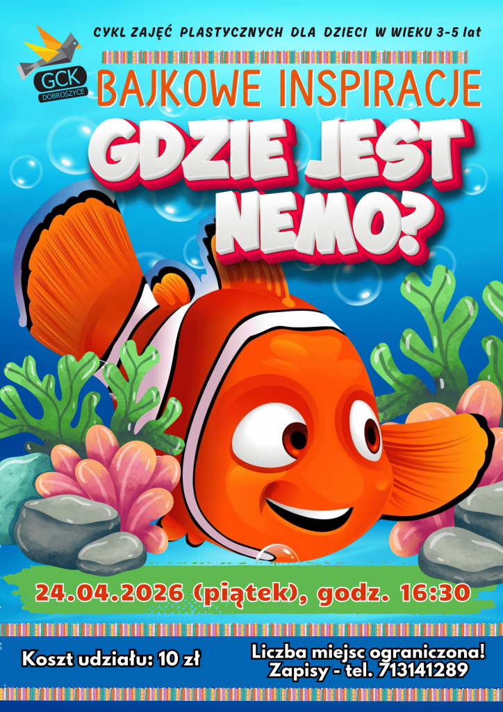 Tematem spotkania będzie: „Gdzie jest Nemo?” Czeka nas kreatywna zabawa pełna kolorów i morskich inspiracji! Koszt: Koszt: 10 zł