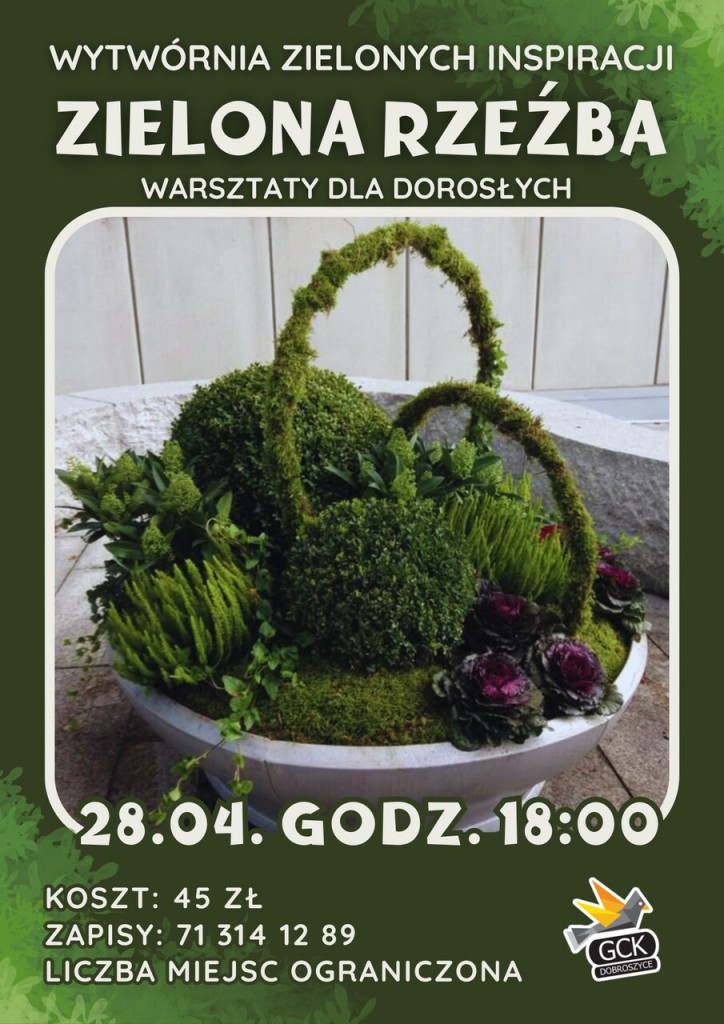 Gminne Centrum Kultury im. Anny Sojko zaprasza na Wytwórnię Zielonych Inspiracji, czyli wspaniałe warsztaty dla dorosłych pn. „Zielona rzeźba”.